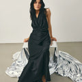 De jurk is een prachtige lange satijnen jurk met elegante waterfall-plooien aan de voorkant. Perfect voor speciale gelegenheden, combineer met hakken en een stijlvolle tas voor een verfijnde uitstraling.